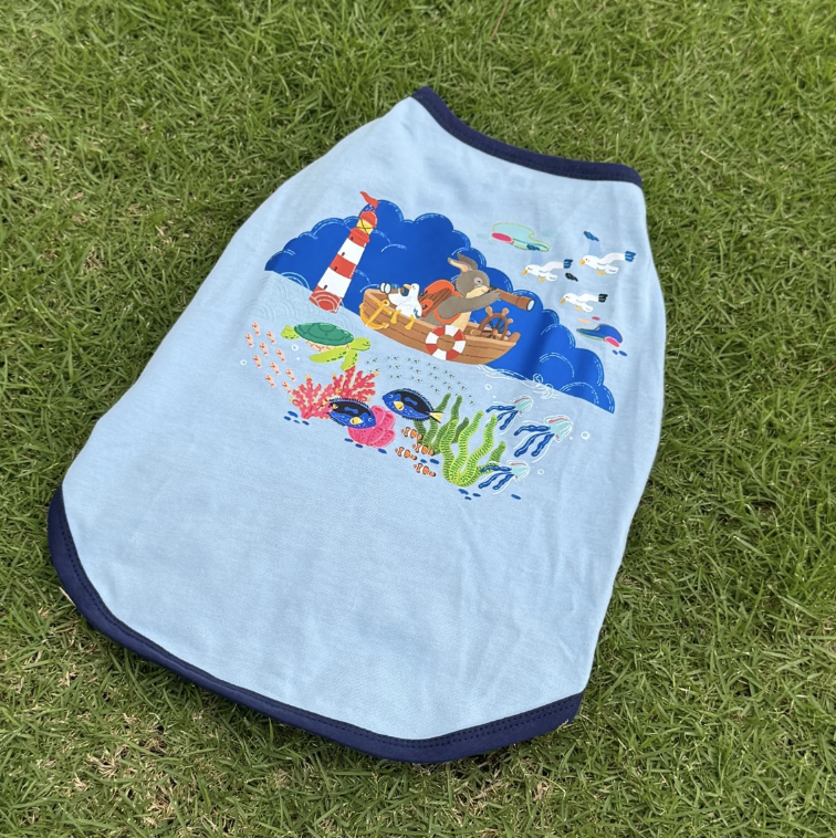The design features dark trim to make the legs stand out (or to frame the leg openings). It has a curved, comfortable fit around the body with a wide-cut shoulder/sleeve design, making it ideal for the hot weather in Thailand. The fabric has a slight stretch to naturally conform to your pet's body shape.